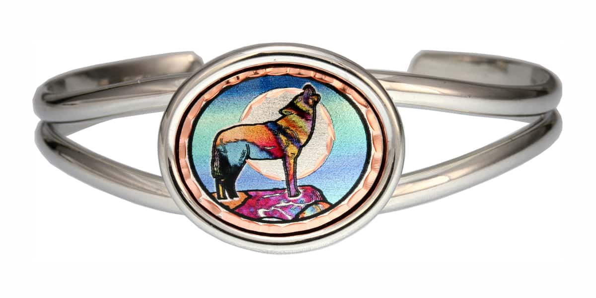 Howling wolf artwork created in striking colors on this handmade wire bracelet. The wolf has a unique ability to hunt its prey and create its own habitat. Its intellectual capacity is extremely high. Copper Reflections have talented artisans who have more then 25 years of experience in their craftsmanship.