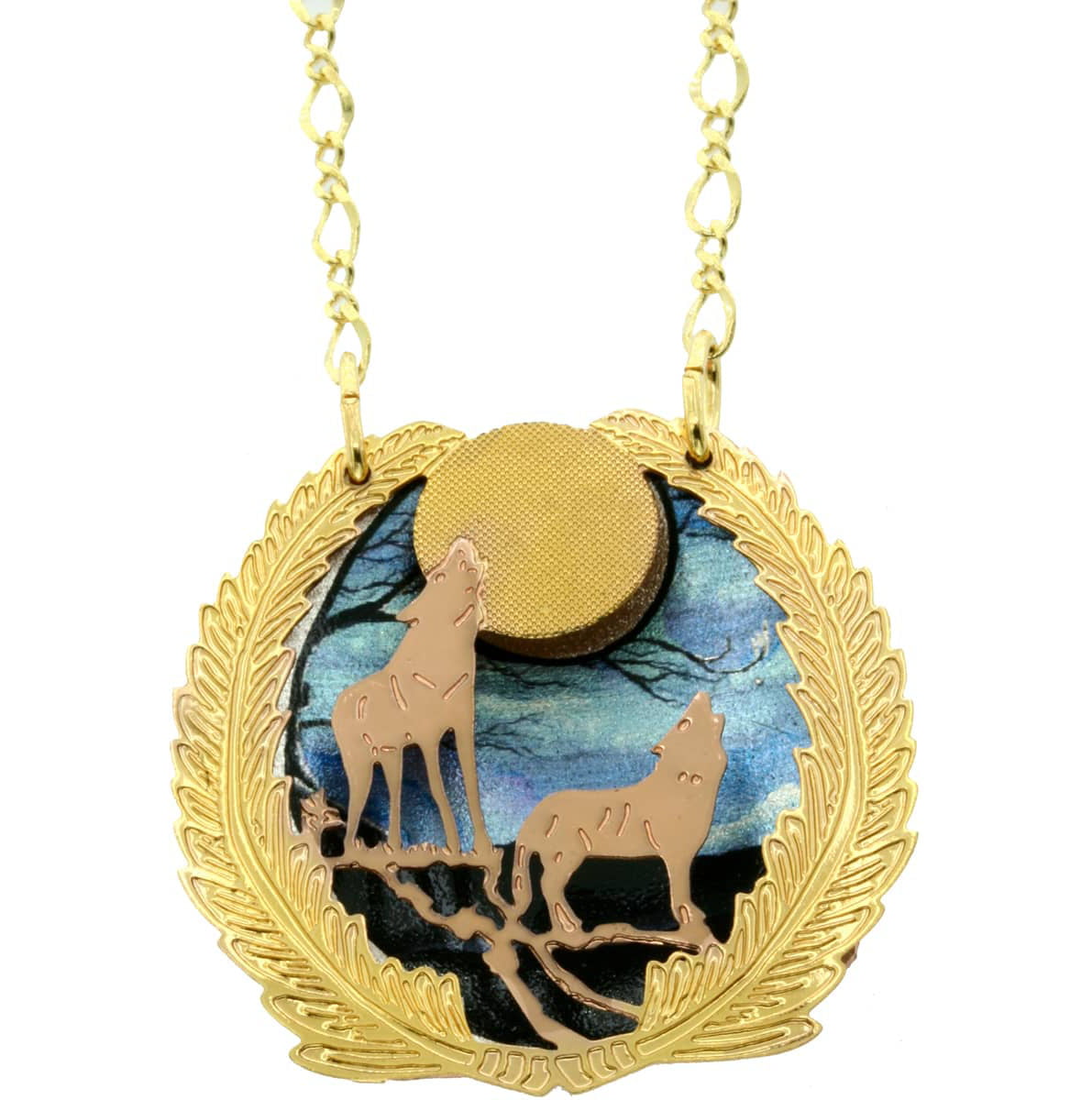 Treat yourself to howling wolves necklace is so pretty and feminine and you will not see them anywhere else. Design is etched through copper with a gold-filled border with colorful copper art background to give this beautiful pendant a 3D effect.