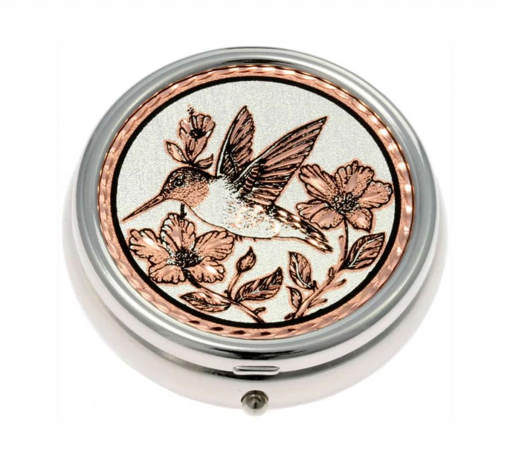 Unique pill boxes have silver plated and diamond cut copper artwork handcrafted by the skilled artisans of Copper Reflections in this fabulous hummingbird design. The Hummingbird is a spirit messenger and represents the ability to stop time. He also represents joy and beauty.