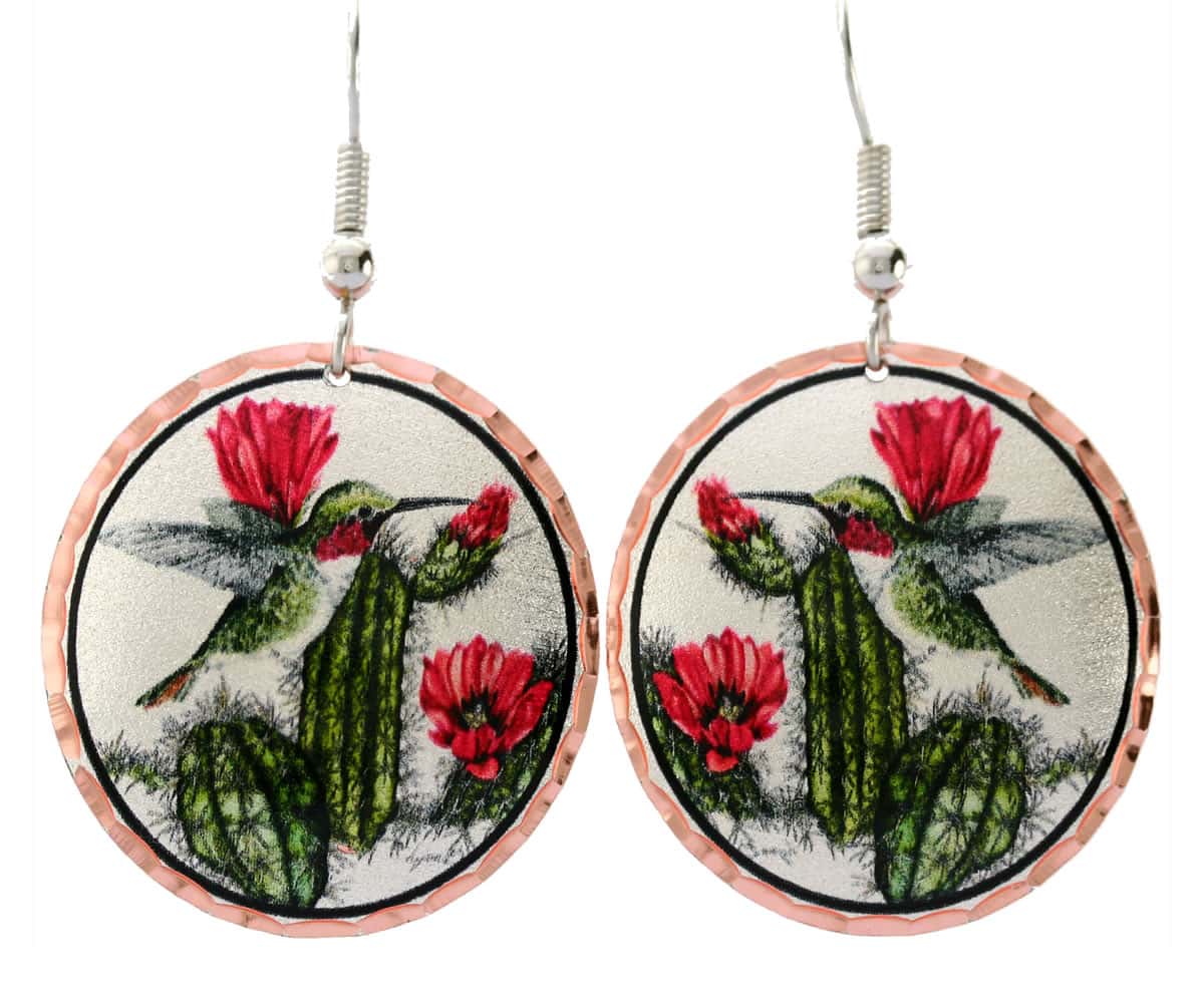 Colorful hummingbird with cactus design on copper handmade earrings. This lovely design from Lynn Bean is recreated as handcrafted earrings by the artisans of Copper Reflections.