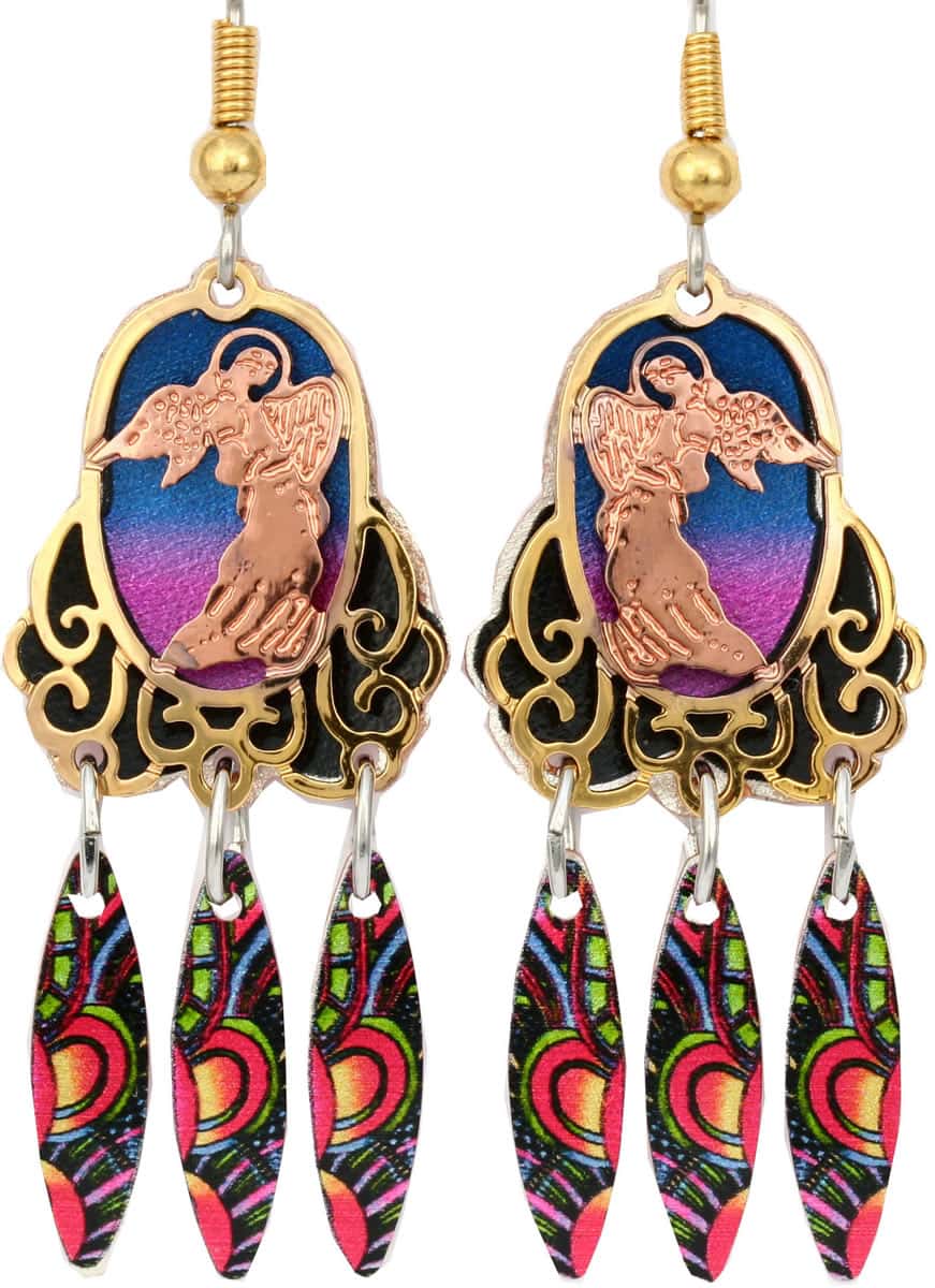 Angel earrings are made in gold and copper etched angel artwork with a colorful copper dangle design as background. Buy cut-out colorful earrings for women who love unusual jewelry that can not be found elsewhere. Introducing Angel Earrings, a masterpiece of artistry and elegance, handcrafted by the talented artisans at Copper Reflections. These unique earrings are a fusion of spirituality, individuality, and high-quality craftsmanship that will leave everyone impressed.