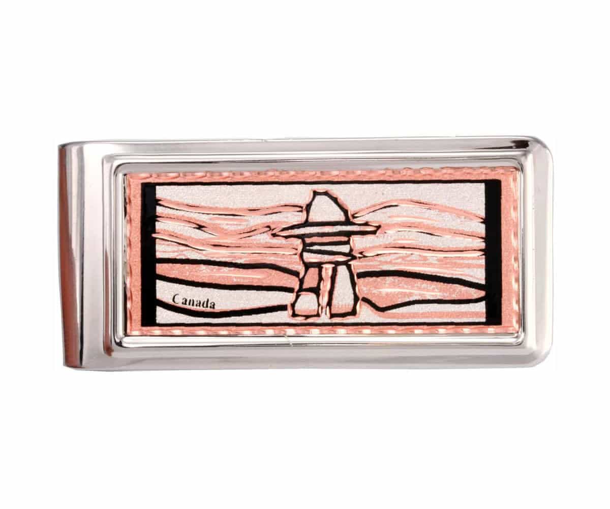 Inukshuk money clip created in a silver-plated money clip in Inukshuk copper artwork by Copper Reflections. Buy unique money clips with Canadian Native designs. Inukshuk is the Inuit word meaning the image of man. Groups of stacked stones usually in human form have been used by the people of the North for thousands of years. These beacons of the North have now been adopted as symbols of friendship, reminding us that we all depend on one another.