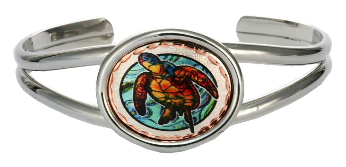 Whimsical Sea Turtle bracelets designed by Jo Lynch are handcrafted by the artisans of Copper Reflections, silver plated and diamond cut to make them sparkle then inlaid on this gorgeous wire bracelet.