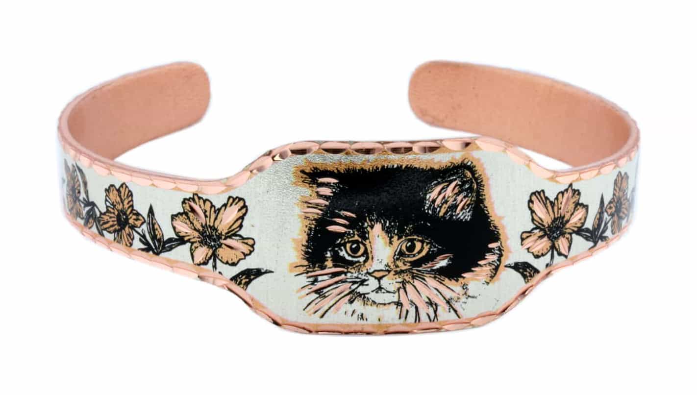 Purchase this kitten artisan bracelet is made by hand in our classic style with earth tones copper and silver with black color accents. Copper Reflections, the top handmade jewelry site offers cat artisan bracelets in the unique jewelry sets.