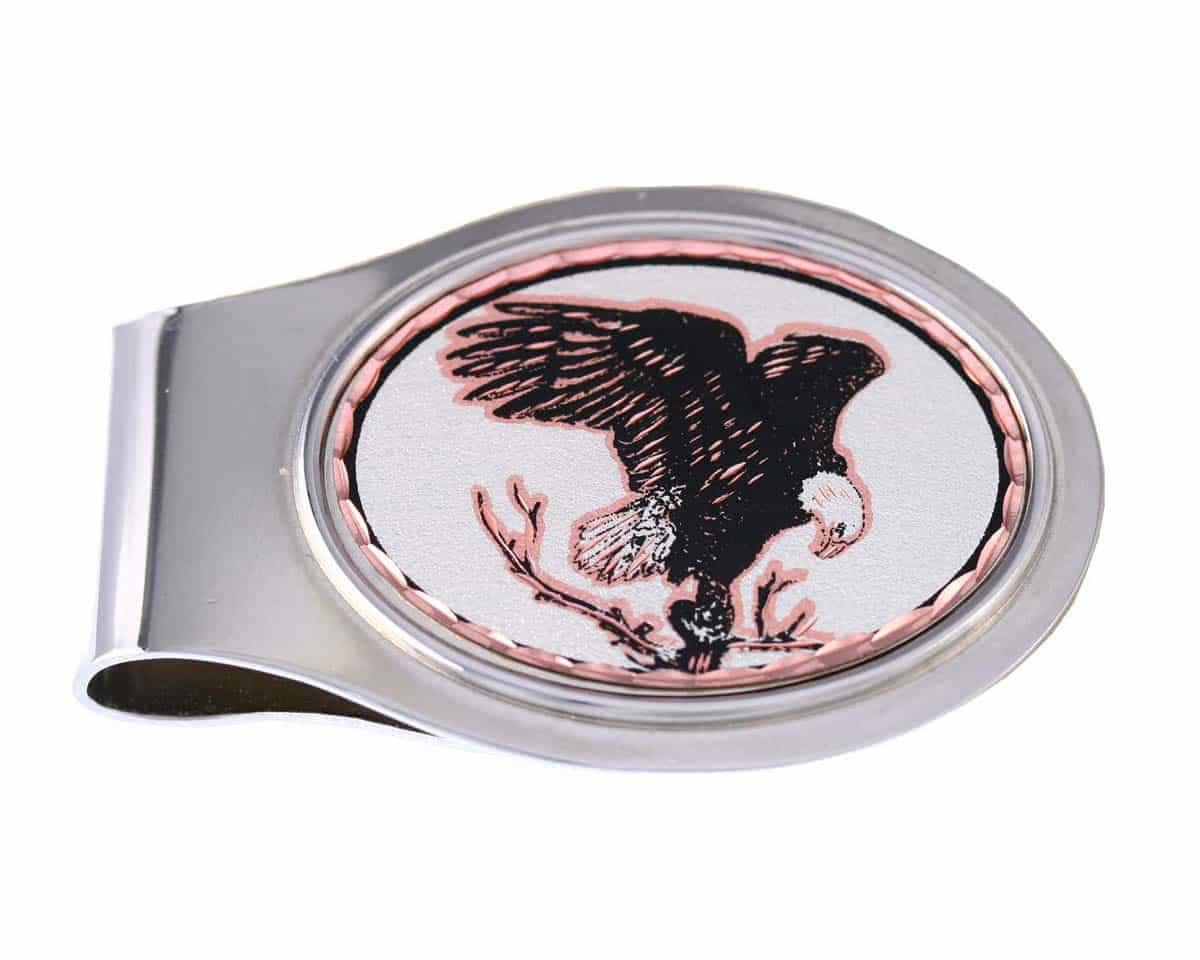 Unique oval shape money clip with copper artwork that is silver plated and diamond cut in landing American eagle design would be great birthday gift that is functional.