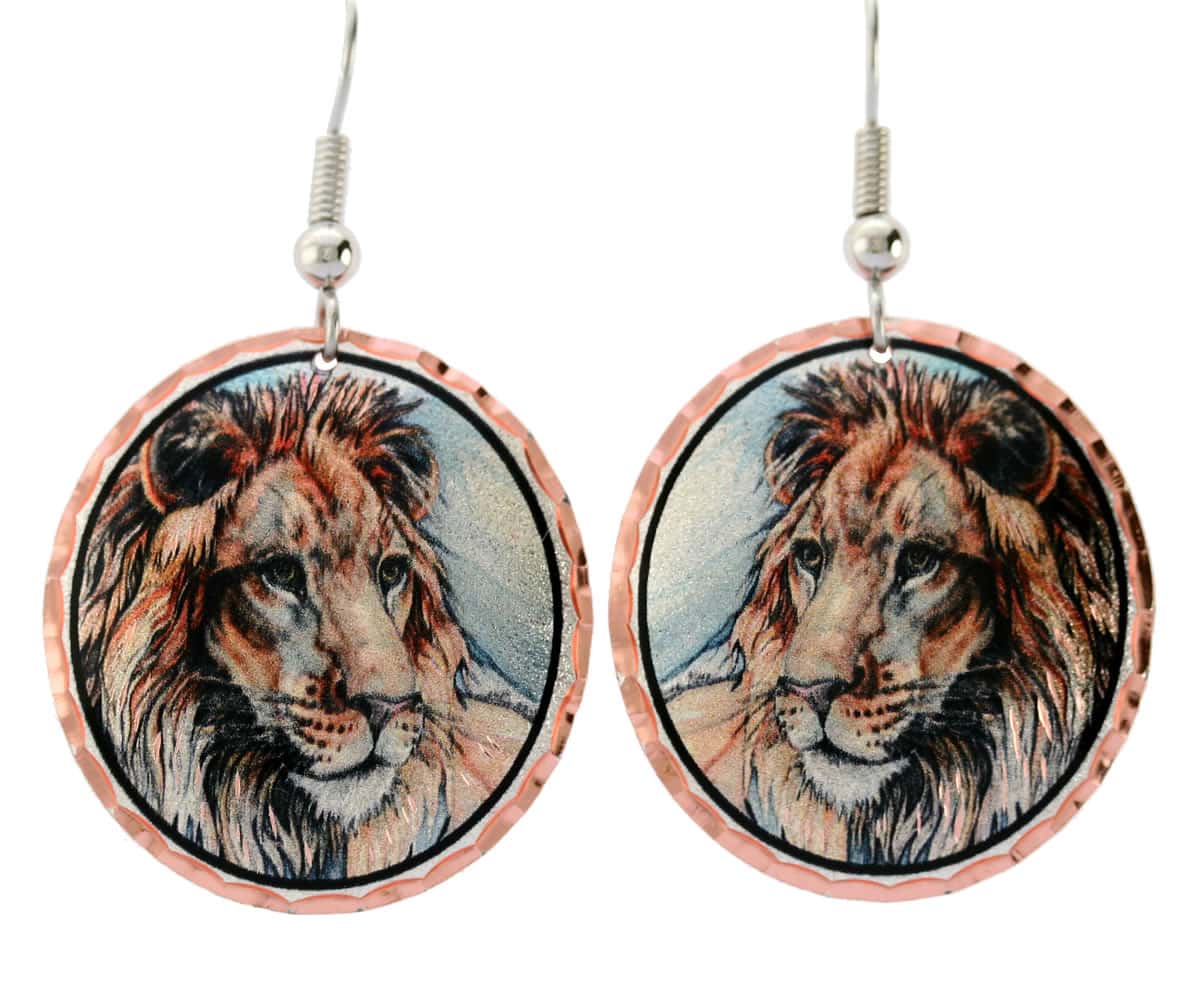 Lion earrings are handmade from copper with amazing lion artwork in brilliant colors and sparkling diamond cuts, Buy lovely African wildlife earrings earrings unique and beautiful. Introducing our magnificent Lion Earrings, a true work of art that will leave everyone mesmerized. Handcrafted with passion and precision by our skilled artisans at Copper Reflections, these earrings are made from copper and adorned with stunning lion artwork in vibrant colors. The fusion of elegance, artistry, spirituality, and individuality makes these earrings truly unique. Each piece is diamond cut by hand to create a luxurious sparkle that will catch everyone’s attention.