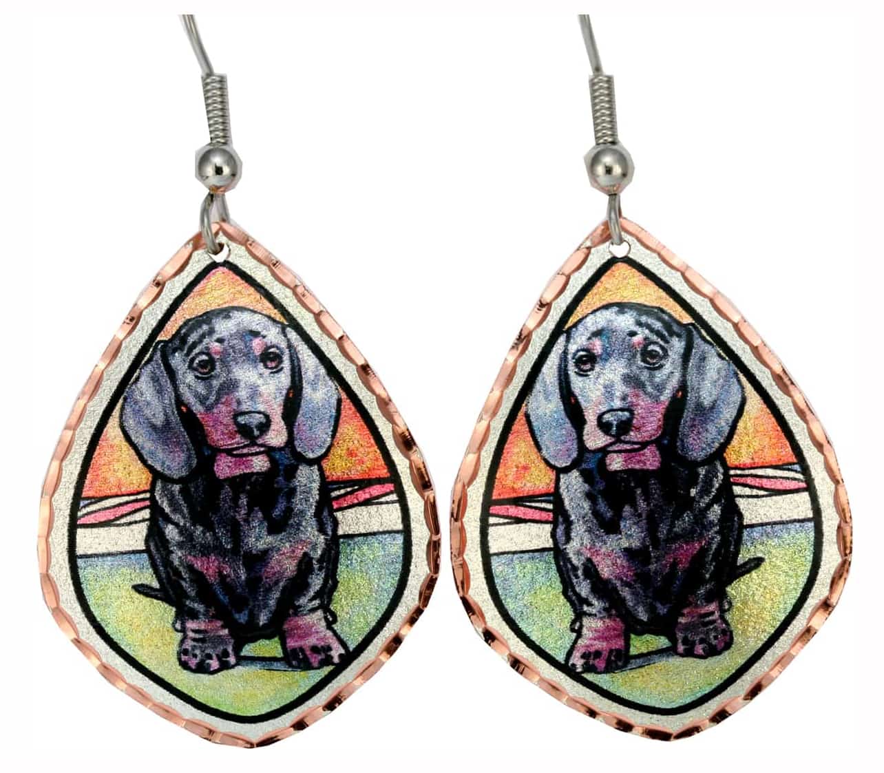 Dachshund dog earrings are made from copper in colorful dog artwork designed by Lynn Bean. Shop lovely and quality dachshund earrings for women. These wonderful diamond shape dog earrings are 25 mm x 32.8 mm ( about 0.98 x 1.3 inches ) in size. Earrings are lightweight, ear wires are the best quality surgical steel hypoallergenic so you can comfortably and safely wear them for a long time even if you have sensitive skin.