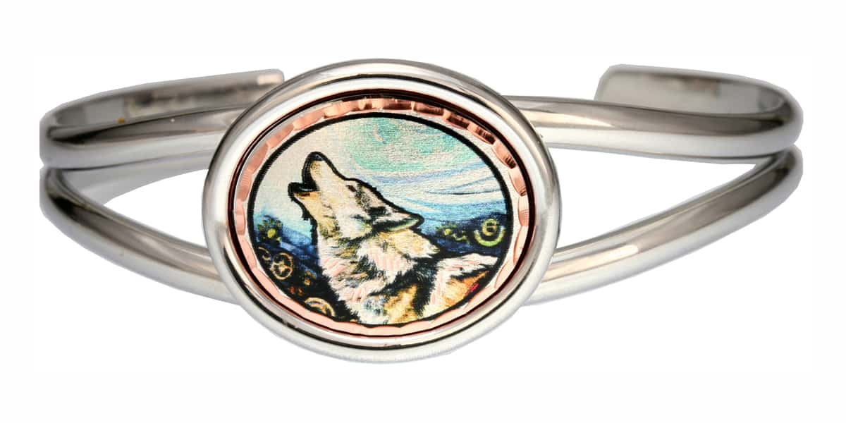Wildlife gifts do not get any better than this fascinating timber wolf artwork from Lynn Bean. Wolf lovers will adore this unique bracelet handcrafted by the skilled artisans of Copper Reflections.