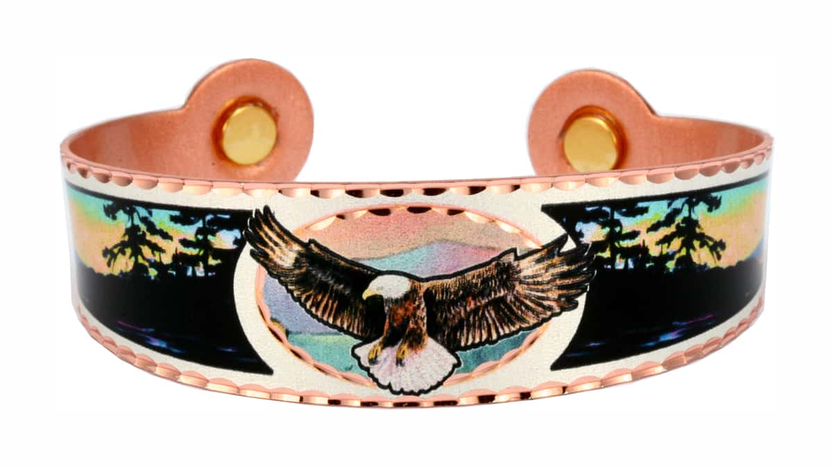 Handmade copper bracelets with magnets are created in this colorful soaring American Bald Eagle with a sunset sky and woods design. These wonderful magnetic bracelets are handcrafted, silver plated and diamond cut.