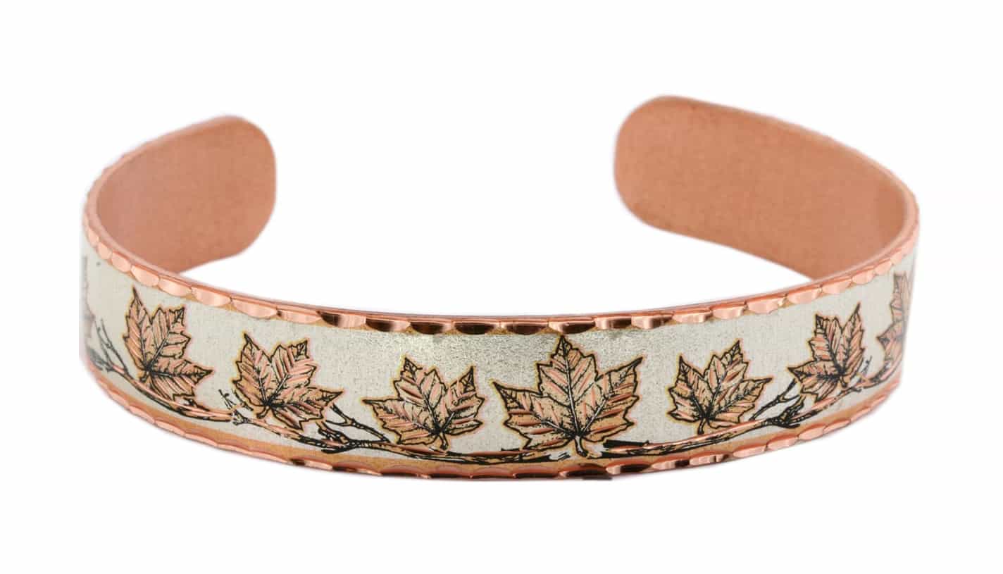 Elegant maple leaves handmade copper bracelets will black and silver accents with sparkling diamond cuts. Buy maple leaf cuff bracelets that will inspire and delight you. Beautifully crafted from copper in the finest details, this maple leaf bracelet is designed to impress everyone.