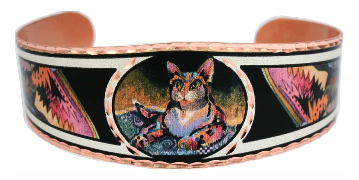 Maximilian cat bracelets are handcrafted from copper in whimsical cat artwork by Bob Coonts. Buy artful and extraordinary cat bracelets for women. Copper Reflections artisans’ aim is to get you noticed in crowds and also get you compliments! You can now have art for your wrist created in fascinating artwork using extraordinary techniques. To enjoy our handmade jewelry for a much longer time, please do not expose them to hair sprays, perfume, and cleaning chemicals.