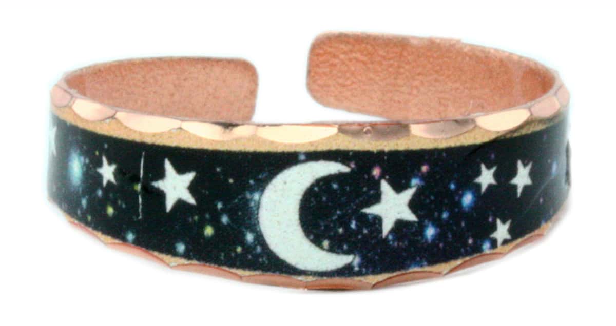 Moon and star rings are handcrafted from copper in the silver-tone moon and star design with dark space background. Buy delicate rings that will be the perfect jewelry for any occasion. Adjustable handcrafted copper rings are 0.7 cm (0.27 inches) wide in the middle and 6.2 cm (2.4 inches) long. Fit most fingers sizes 6 to 10. No polishing is required as the copper rings are protected from tarnishing with many layers of finishes we also dip them into lacquer for thicker and better protection.