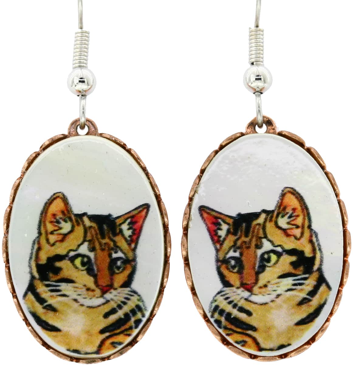 Shell jewelry cat earrings are created from mother of pear with colorful and lovely tabby cat artwork. Buy shell cat earrings for women who love cats. Mother of pearl earrings is inserted into pretty oval shape copper bezels that are about 17 mm x 25.7 mm (0.66 inches wide and 1 inch long). Cat shell earrings for women have high-quality hypoallergenic surgical steel ear wires so you can safely wear them even if you have sensitive skin. No polishing is required as each piece of our handmade jewelry is protected by many layers of finishes.