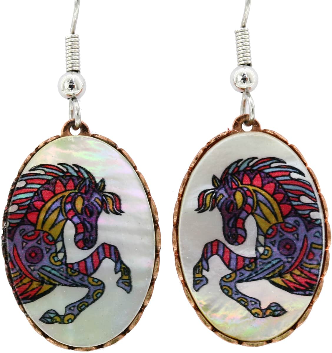 Shell abstract horse earrings created from mother of pear with colorful and lovely artwork. Buy feminine and aesthetic shell horse earrings. Mother of pearl earrings is inserted into pretty oval shape copper bezels that are about 17 mm x 25.7 mm (0.66 inches wide and 1 inch long). Whimsical horse earrings for women have high-quality hypoallergenic surgical steel ear wires so you can safely wear them even if you have sensitive skin. No polishing is required as each piece of our handmade jewelry is protected by many layers of finishes.