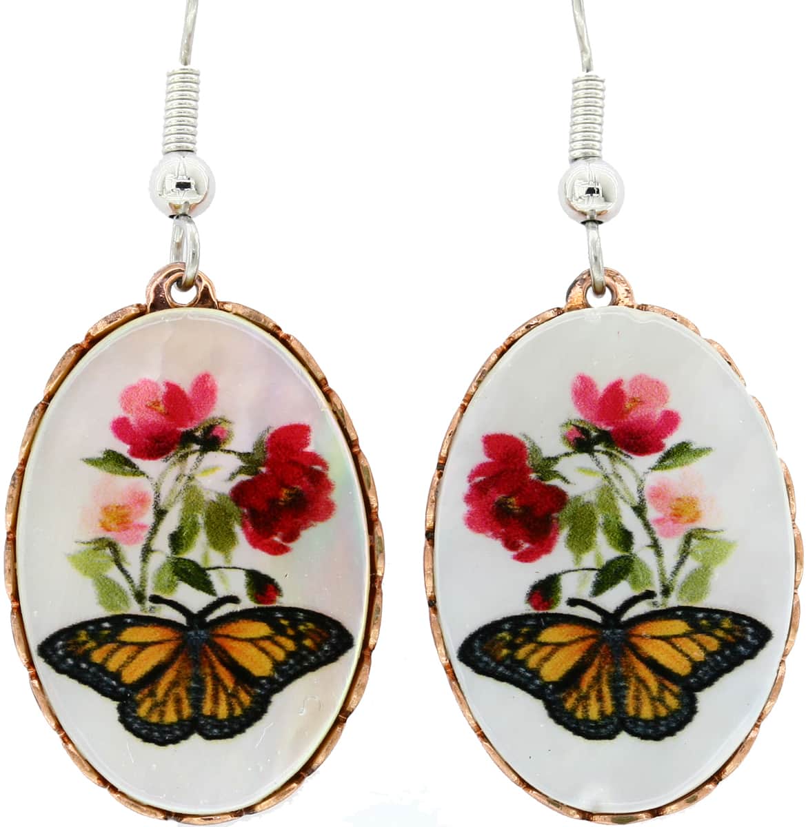 Shell jewelry monarch butterfly earrings created from mother of pear with colorful and lovely butterfly artwork. Buy monarch butterfly earrings that will exceed your expectations. Mother of pearl earrings is inserted into pretty oval shape copper bezels that are about 17 mm x 25.7 mm (0.66 inches wide and 1 inch long). Monarch butterfly earrings for women have high-quality hypoallergenic surgical steel ear wires so you can safely wear them even if you have sensitive skin. No polishing is required as each piece of our handmade jewelry is protected by many layers of finishes.