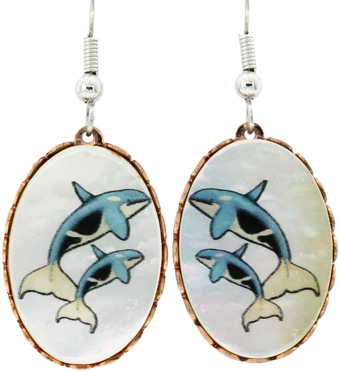 Shell jewelry whales earrings created from mother of pear with colorful and lovely artwork. Buy feminine and captivating shell whale earrings. Mother of pearl earrings is inserted into pretty oval shape copper bezels that are about 17 mm x 25.7 mm (0.66 inches wide and 1 inch long). These lovely shell whale earrings have high-quality hypoallergenic surgical steel ear wires so you can safely wear them even if you have sensitive skin. No polishing is required as each piece of our jewelry is protected by many layers of finishes.