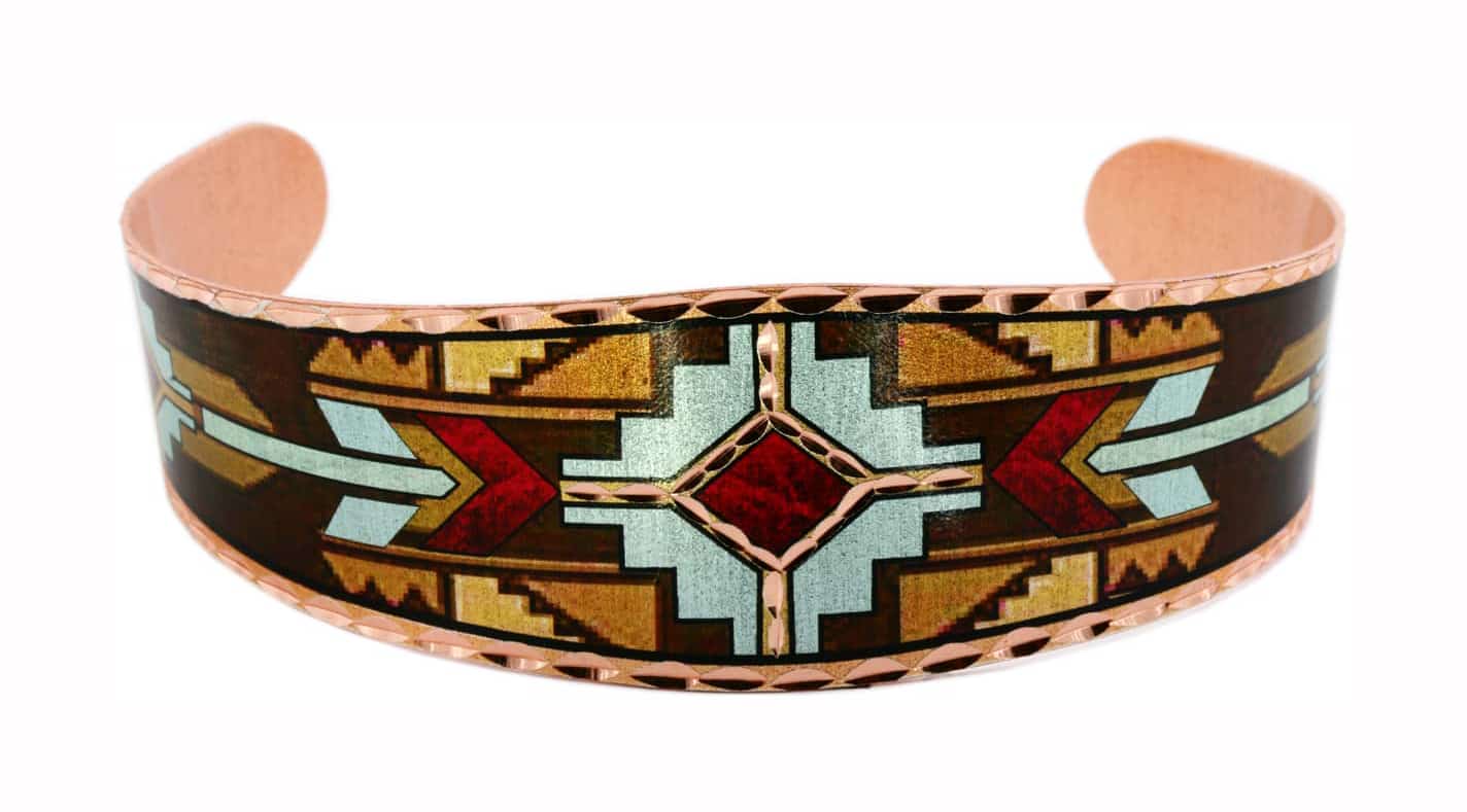 Artisan Native American bracelet is handmade from copper in turquoise, golden, red, and brown colors. Buy beautifully colorful Native American bracelets that you can not find anywhere else. Bracelets are adjustable and protected with many layers of clear acrylic finish to protect them from tarnishing. They are about 2 cm wide in the middle and about 15 cm long ( about 0.8 wide inches wide x 6 inches long).