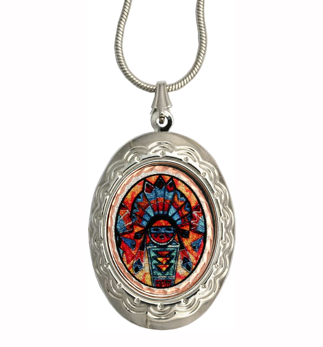 The extraordinary locket necklace is made in a silver-tone locket embellished with colorful copper Native artwork with a lovely chain. Buy chic photo locket necklaces to hold your memories close to your heart. Fancy jewelry locket necklaces for women are made in silver tone lockets and decorated with amazing copper artwork. Makes a special gift to keep photos of your loved ones. Photo locket necklaces are available with 20 inches long silver-tone snake chains. Bright and bold, this colorful Southwest Native Kachina artwork by Lynn Bean is transformed into the most unique locket by the skilled artisans of Copper Reflections.