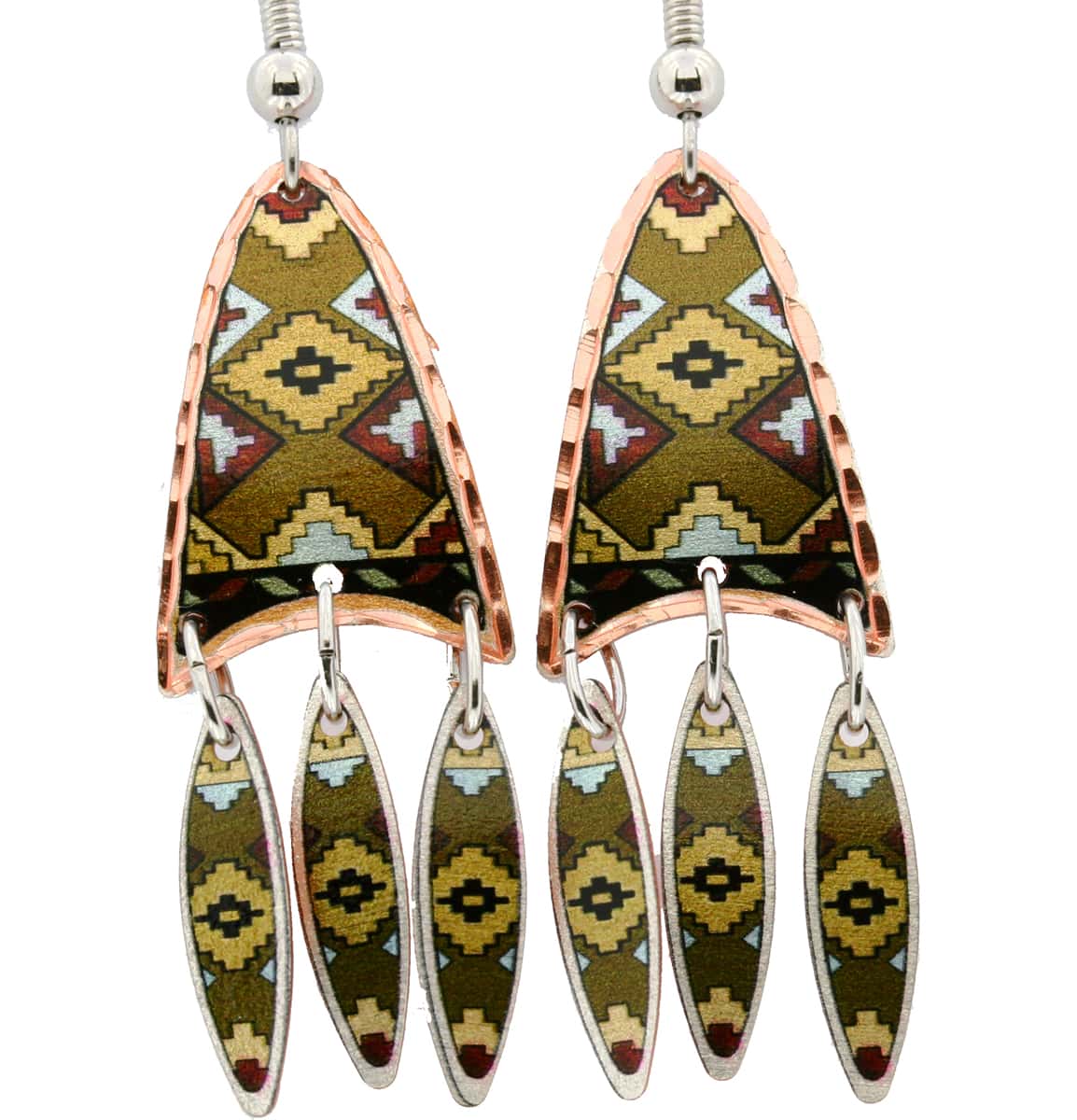 Native copper dangle earrings will impress everyone with their quality and originality. Buy artisan-made dangle Native Indian earrings in golden colors with sparkling diamond cuts. No polishing is required as we coat them with layers of acrylic finishes.
