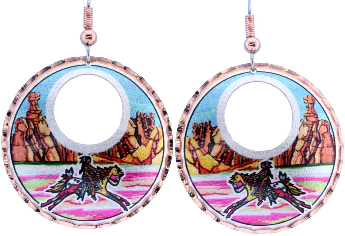 Copper Native Indian warrior earrings handmade in striking shades of colors that are transparent to show depth. Copper Reflections offers the best affordable and fine quality Native American art jewelry. Purchase Native Indian warrior earrings made from copper with silver plating and diamond cutting to accentuate the beauty.