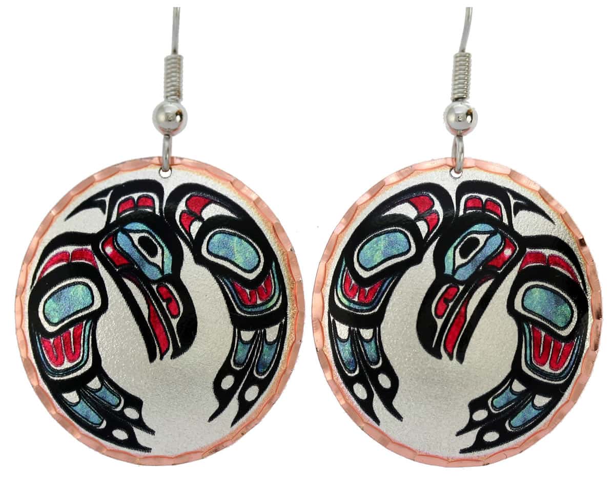 As a symbol of peace and friendship the eagle totem is found often in Northwest Native jewelry designs. These colorful eagle totem earrings are handcrafted, silver plated and diamond cut on oval copper earrings.