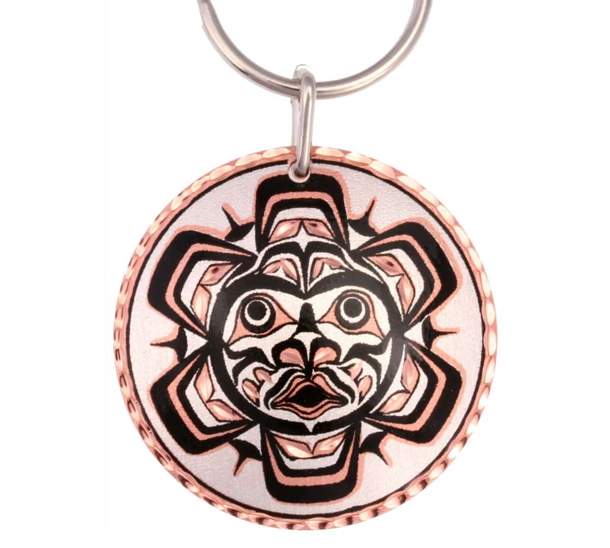 Unique keychains handcrafted by skilled artisans, silver plated and diamond cut on copper in this Northwest Native American Sun totem design. In Northwest Native legends, the sun is known to provide the earth with healing energy and life.