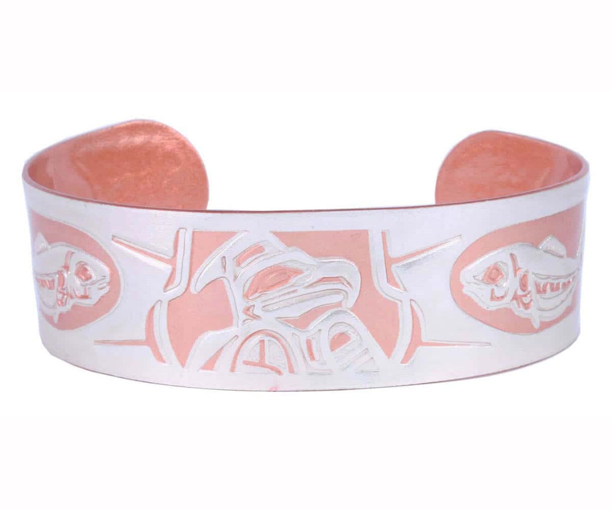 Embossed men’s copper bracelets in Northwest Native American jewelry Haida eagle and salmon totem design. A symbol of power and prestige among the Native People of the Northwest Coast, the eagle embodies courage, spirit, and bravery. The salmon is considered the life source for West Coast Tribes.
