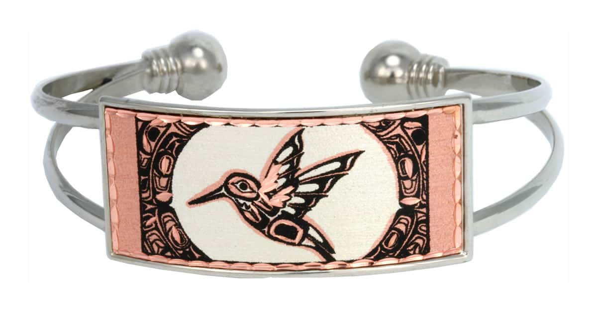 Handmade wire bracelets are handcrafted in Northwest Native jewelry hummingbird theme by the artisans of Copper Reflections. The hummingbird represents friendship, playfulness, and is a symbol of good luck in Northwest Coastal Native art. It is a positive sign to see a hummingbird prior to a major event such as hunting, traveling or marriage.