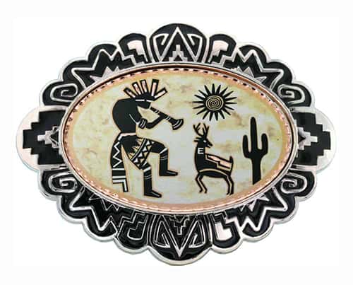 Copper Kokopelli western belt buckle made from silver-plated zinc alloy with black epoxy accents and decorated with magnificent copper Kokopelli design. The overall size of western belt buckles is 3 inches x 4 inches (7.8 cm x 10 cm ) and the belt holder will hold up to 1 3/4 inch (4.5 cm) wide belt. Kokopelli is regarded as the universal symbol of fertility for all life whether for crops, hopes, dreams, or love. Wholesale western belt buckles are handmade from start to finish at our workshop with quality and artistic designs in mind.