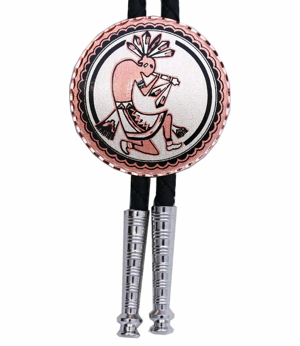 Southwest Native American kokopelli bolo tie is handmade, silver plated and diamond cut on copper with 40 inch long black braided bolo cord and silver color tips. If Kokopelli has lured you with his magical flute, it is time to listen to his song of fertility. You are being asked to use your talents to create fertility in some area of your life. If things have been slow moving, his song is saying that whatever you intend to do at this time will be very productive for you.