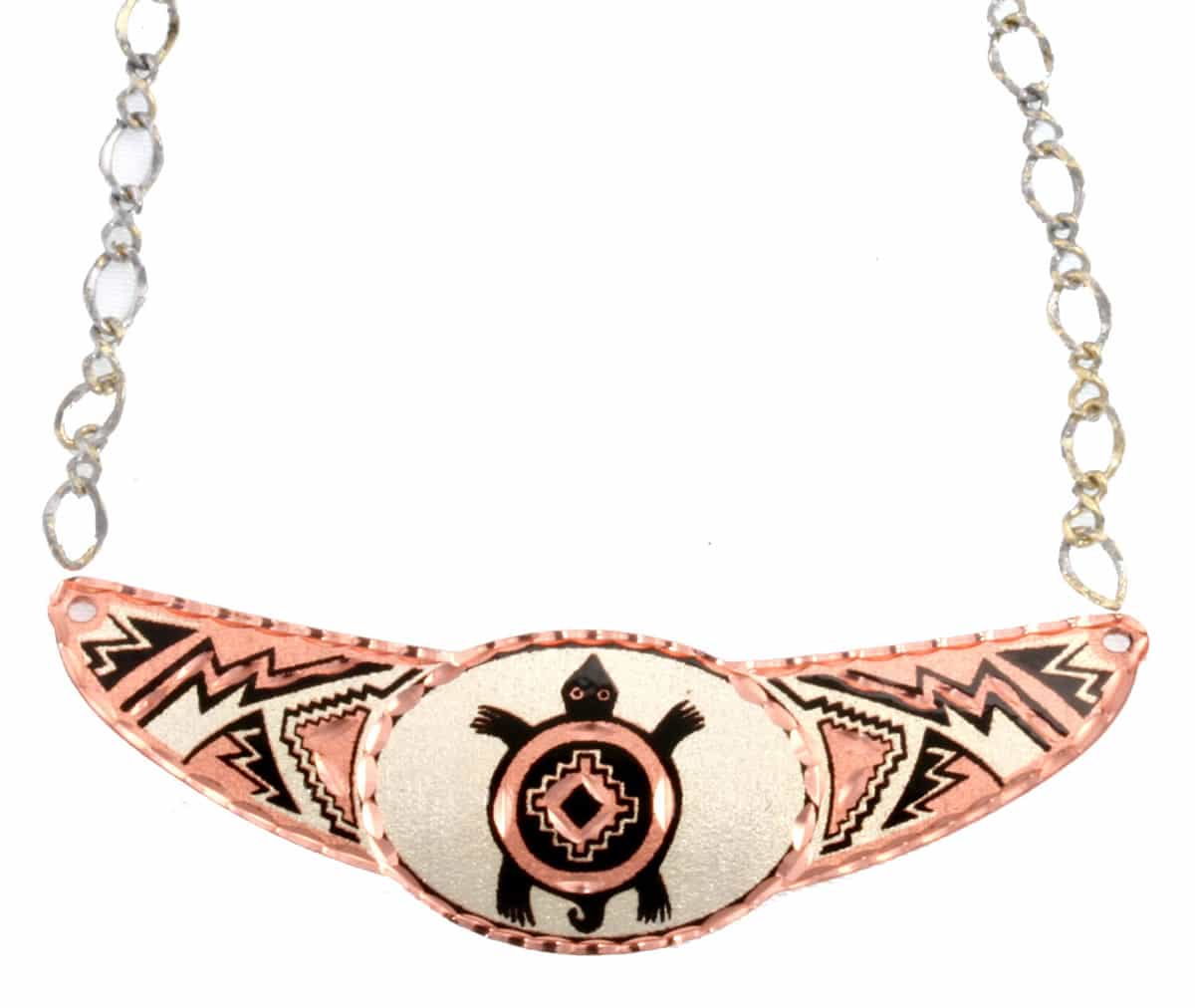 Handmade unique chokers are individually silver plated and diamond cut on copper in this Southwest Native turtle design. The turtle represents Mother Earth. The turtle also symbolizes informed decisions, planning and adaptability. It is also a creature known to bring positive energy, good luck and long life.