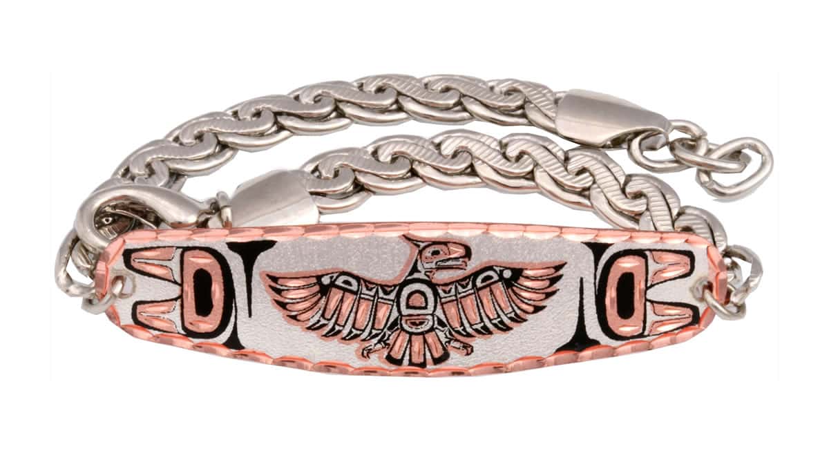 Handmade Native Thunderbird bracelets are handcrafted, silver plated and diamond cut on copper chain bracelets. The Thunderbird is powerful and mystical, a “Great Spirit”. It is the personification of energies in nature. As a totem it will be your protector and liberator.