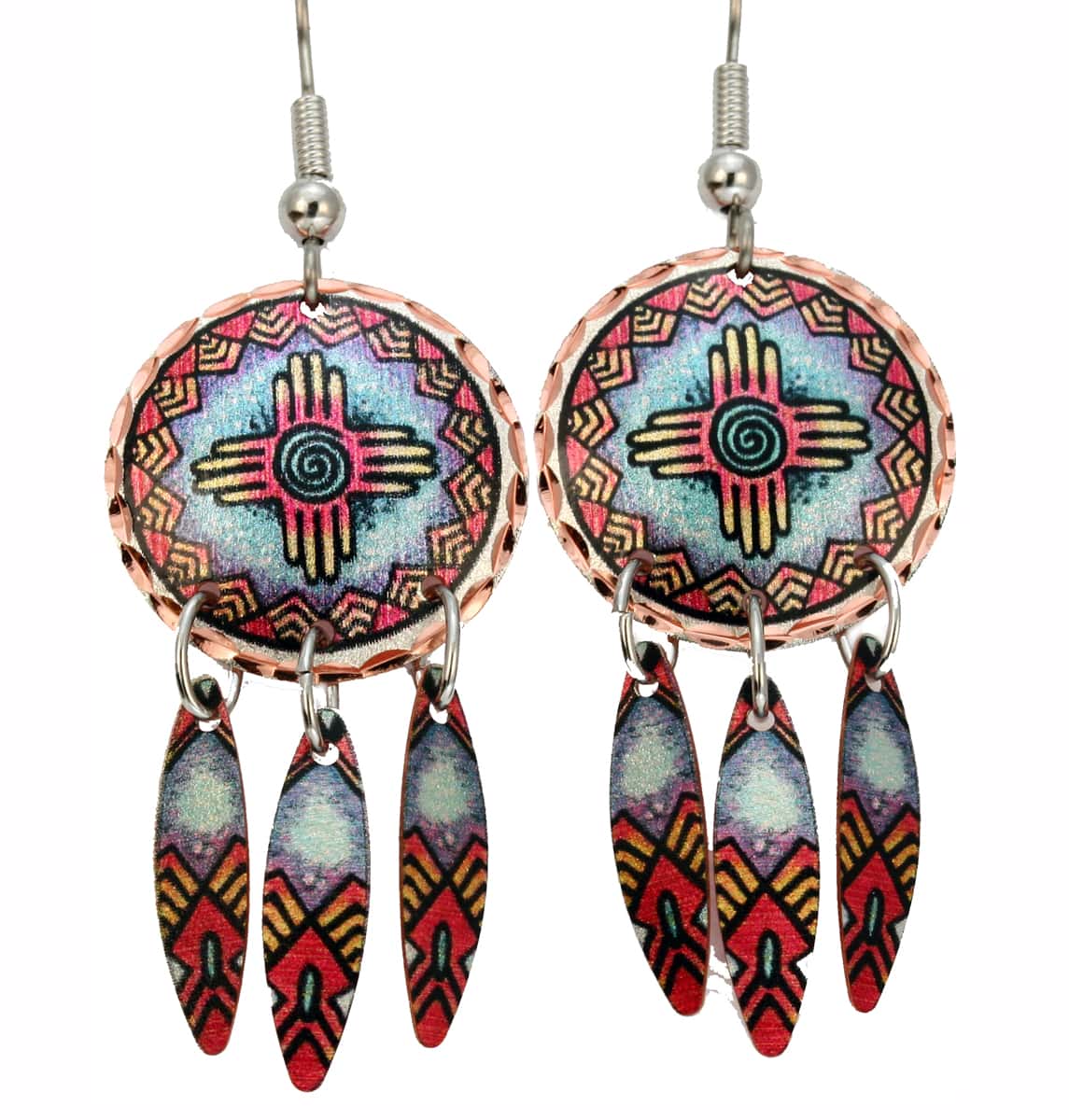 Dangle Zia earrings made in an appealing colorful design that symbolizes the circle of life. Buy dangle Zia earrings Native art jewelry for a sophisticated look. Wear Zia circle of life earrings is perfect making a bold style statement.