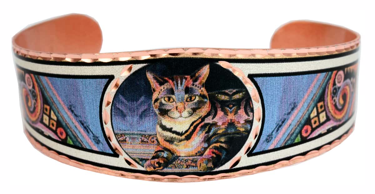 These handmade cat bracelets are silver plated and diamond cut on copper in this beautiful cat artwork of Nickles by Bob Coonts. Bob creates artwork that is unique, fascinating to look at and something that brings joy to everyone.