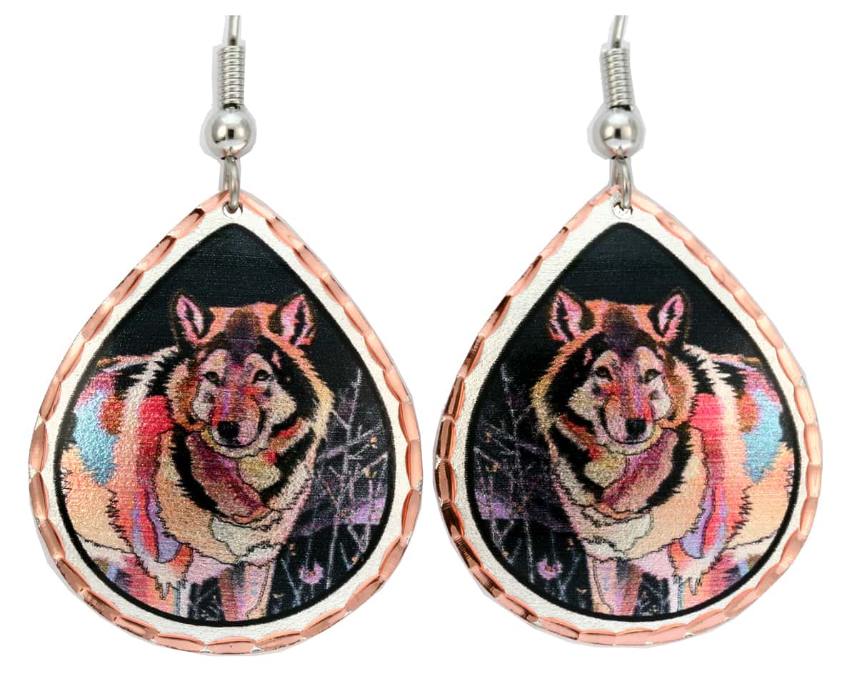 Handmade earrings are individually silver plated and diamond cut by the artisans of Copper Reflections in this wonderful Night Wolf artwork from Bob Coonts. These colorful wolf earrings will make a unique gift for wildlife lovers.