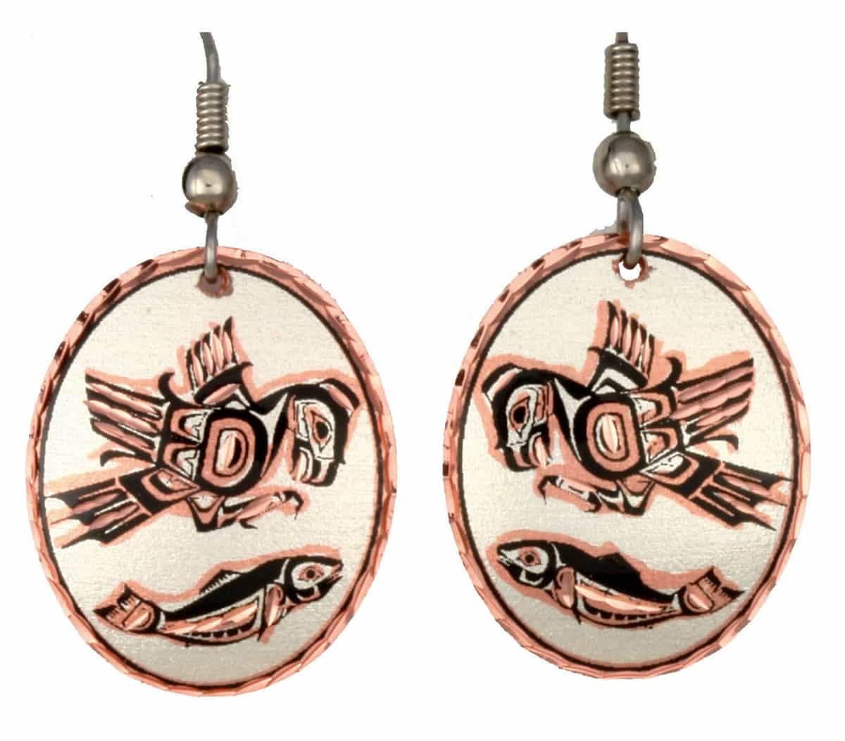 Show off your unique style with our affordable, graceful, and stylish Native eagle and salmon earrings. Handcrafted by Copper Reflections, these unique artisan jewelry pieces are diamond cut to sparkle, and made from copper and silver plated to prevent tarnishing. With surgical steel hypoallergenic ear wires and lacquer finishes, these earrings are a fusion of elegance, artistry, spirituality, and individuality. Impress everyone with their delicate, mesmerizing, and exquisite design. Shop now and show off your trendsetting style!