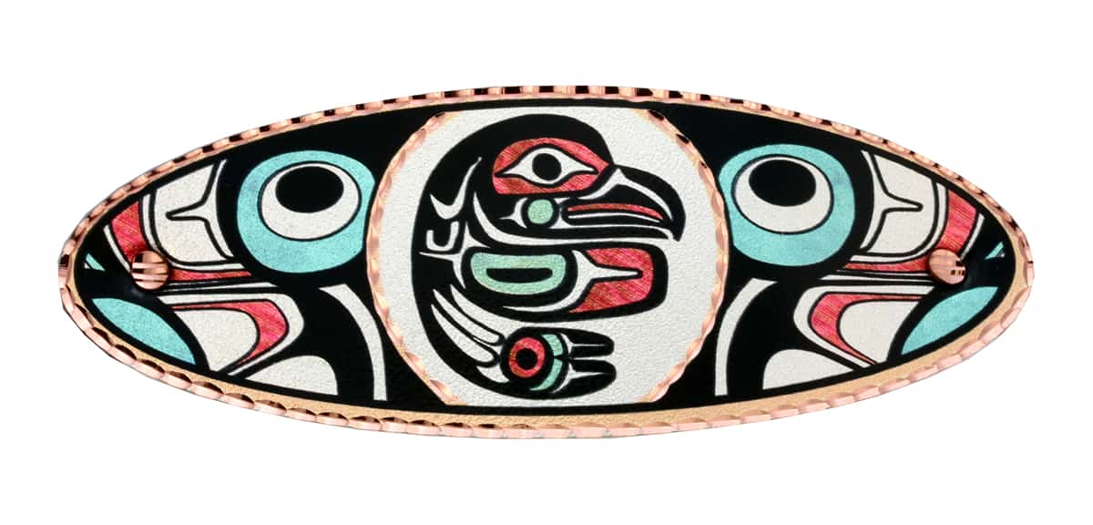 Northwest Native American eagle hair clip handcrafted from copper, silver-plated in a colorful Haida Indian artwork. Shop unique Native eagle hair clips. Hair clips are made in an oval shape 33.5 x 93 mm ( about 1.3 x 3.7 inches) in size. 3 inches long French barrette backings are securely riveted on the back of the copper hair clips. Shop handmade jewelry for women at Copper Reflections fabulously unique and comfortable-to-wear hair clips in fine detail artwork that do not need any maintenance. A beautifully designed and meaningful NW Native eagle hair clip is created in vibrant colors to make you smile every time you wear it. Native Americans consider the bald eagle to be sacred. Because eagles are the highest-flying birds, they were thought to be nearer to the creator.