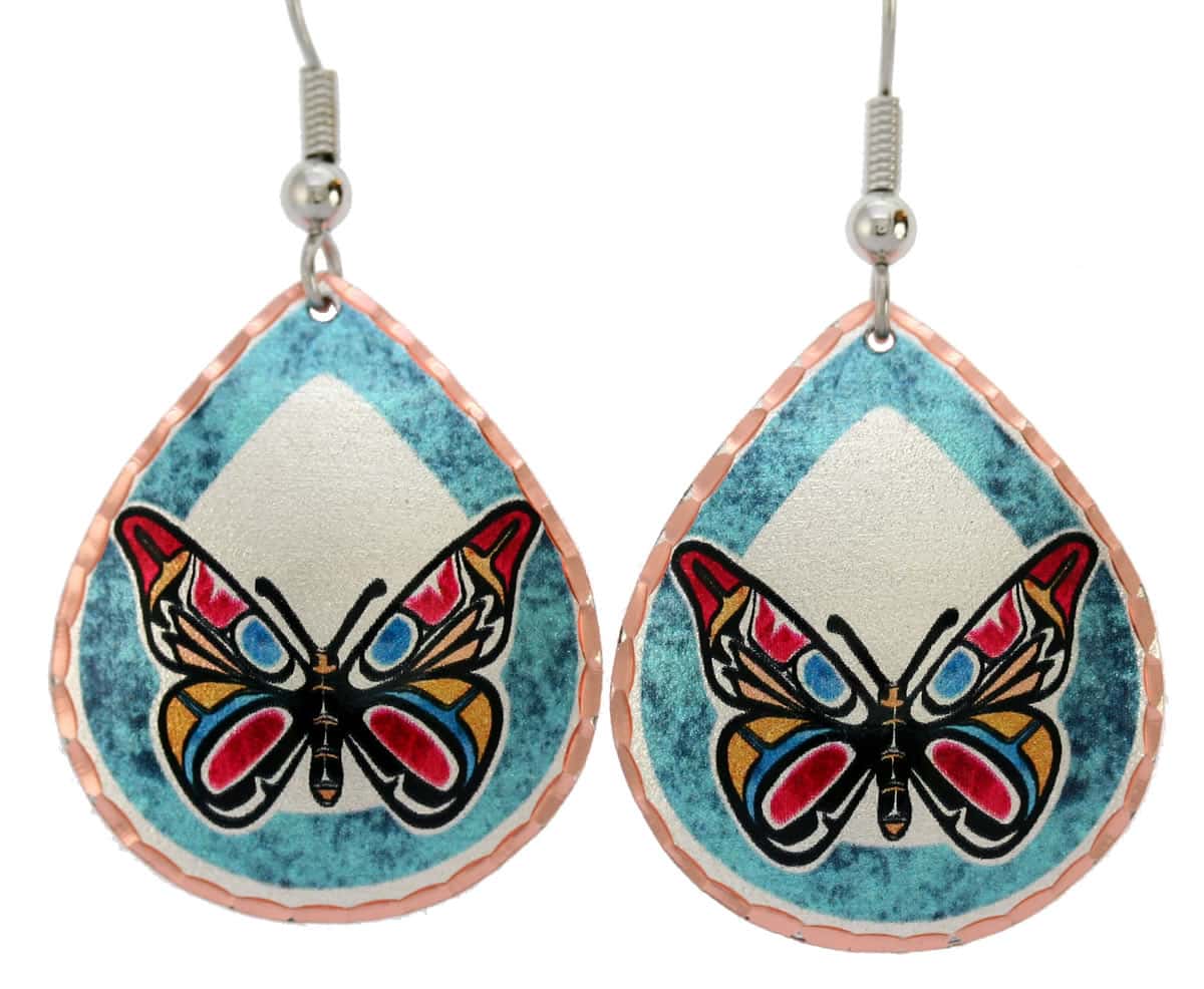 Bright and vivid colors are gorgeous on these Native Northwest Butterfly earrings design. The butterfly is also believed to be a messenger from the spirit world. The message the butterfly brings depends their color. A black butterfly indicates bad news or illness, yellow brings hope and guidance, brown signifies important news, red signifies an important event and white signifies good luck.