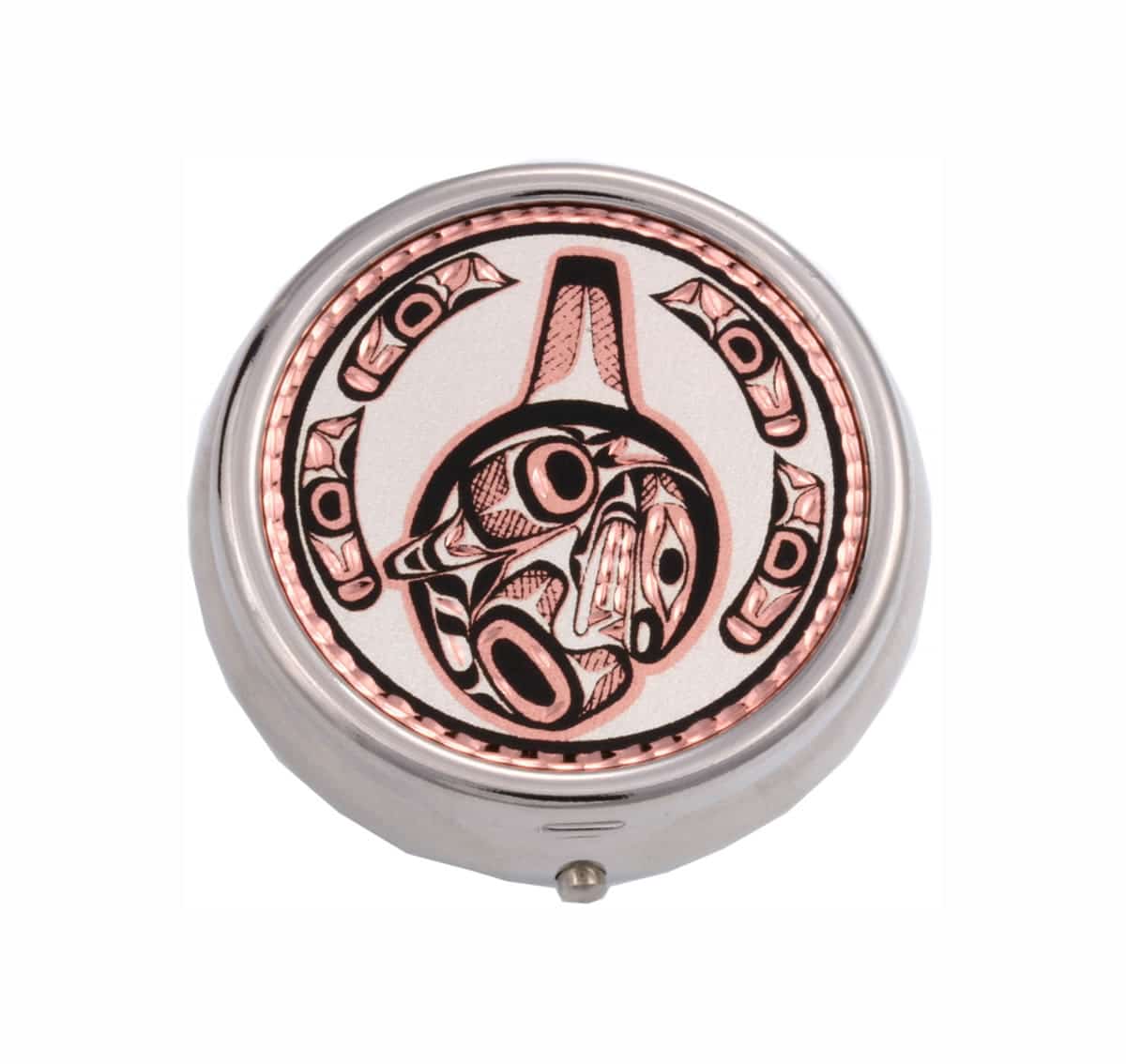 Unique pill box artwork is handmade by the skilled artisans of Copper Reflections in Northwest Native Haida orca or killer whale totem design. The killer whale has long been associated with native stories of creation. Its powers include song and creative inspiration. As a totem it will aid in awakening the inner depths and the creative force of breath. The whale is also the traveler and guardian of the sea.