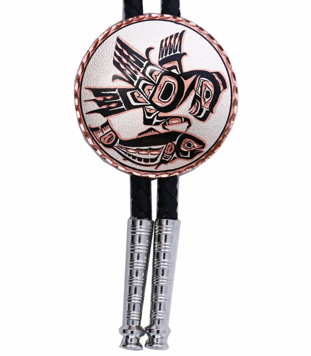 Northwest Native American bolo ties handcrafted in eagle and salmon theme by the artisans of Copper Reflections are silver plated and diamond cut on copper. Bolo cord is 40 inches long with silver color tips. A symbol of power and prestige among the Native People of the Northwest Coast, the eagle is a sacred and wise bird, representing good times to come. The salmon is a main source of food so represents life and prosperity.