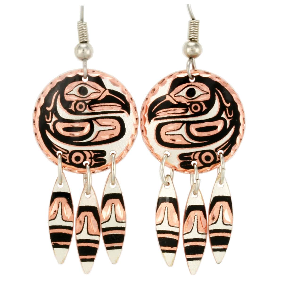 Northwest Native eagle totemic earrings are handcrafted by Copper Reflections and make a great addition to Native gift stores and trading posts in Canada and the United States. The eagle can see the overall pattern and the connection to spirit guides and teachers. The eagle represents great power and balance, dignity with grace, and a creative spirit achieved through knowledge and hard work.