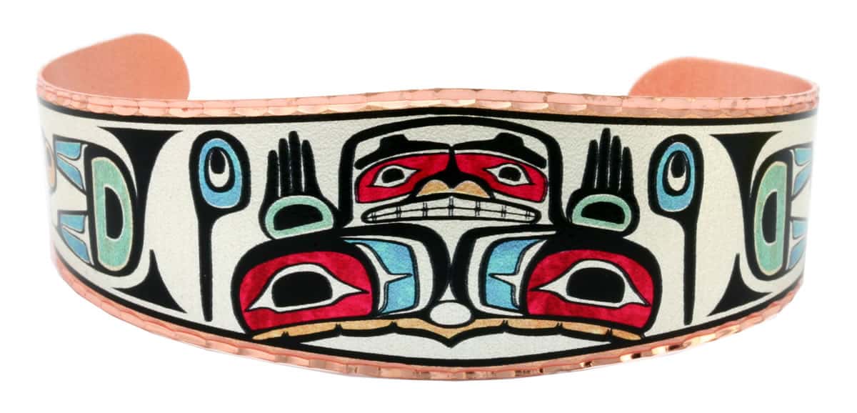Unique bracelets handmade in colorful Northwest Native Haida Hands of Creation design. The killer whale has long been associated with native stories of creation. Its powers include song and creative inspiration. As a totem it aids in awakening the inner depths and the creative force. These gorgeous handmade copper bracelets will compliment any outfit and will be cherished by Native jewelry lovers and make the most unique gifts.