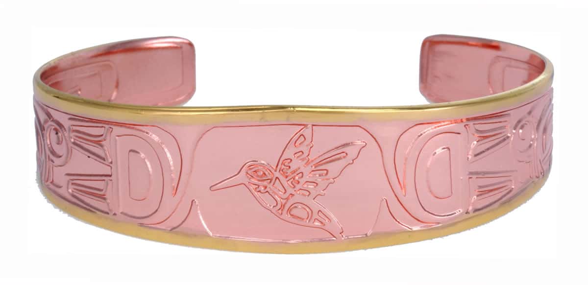 Copper bracelets, Native American bracelet, copper bangle bracelets are embossed with native hummingbird design in two-tone plated gold and copper bracelet. Haida hummingbird design, the hummingbird is the joyful messenger and healer. When the hummingbird appears in a time of great sorrow and pain, healing will soon follow. Each piece of the handmade jewelry has an acrylic coating to prevent our unique jewelry from tarnishing, so no polishing or special care is required.