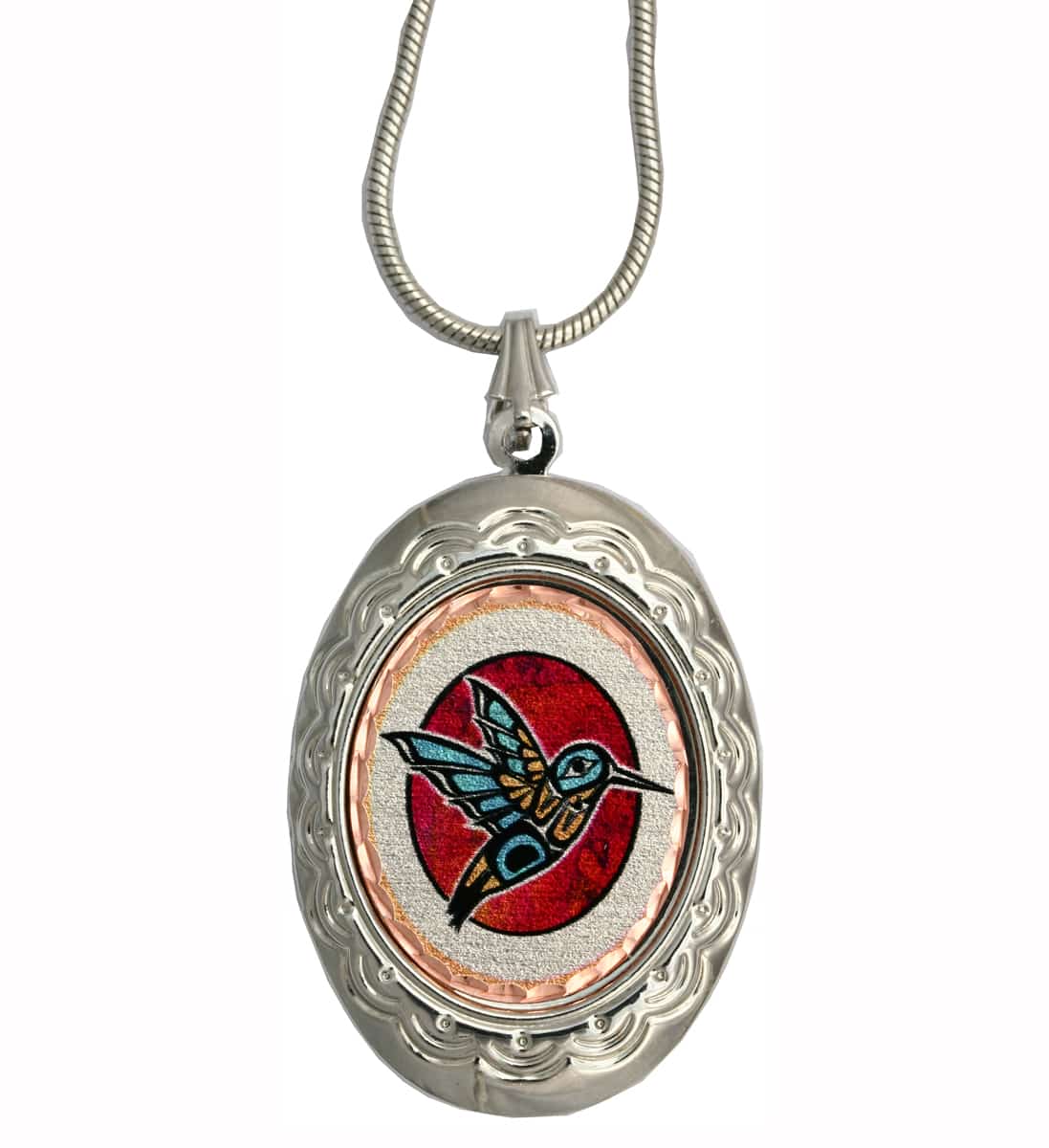 Exceptional lockets with colorful Northwest Native American-inspired hummingbird artwork that is handcrafted, silver plated, and diamond cut on copper. Keep your most precious photo close to your heart with a gorgeous locket necklace.