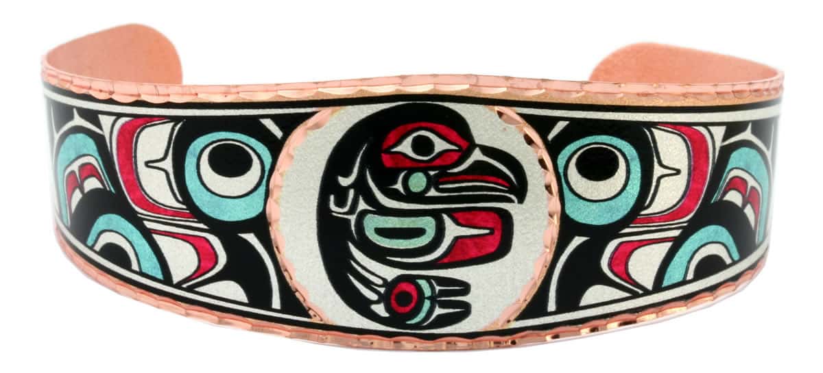 Copper handmade bracelets feature a colorful Native eagle totemic design. Eagle down, considered sacred, was used in ceremonies to welcome someone in friendship. The feathers were sprinkled on the ground before an important visitor came into the tribe.
