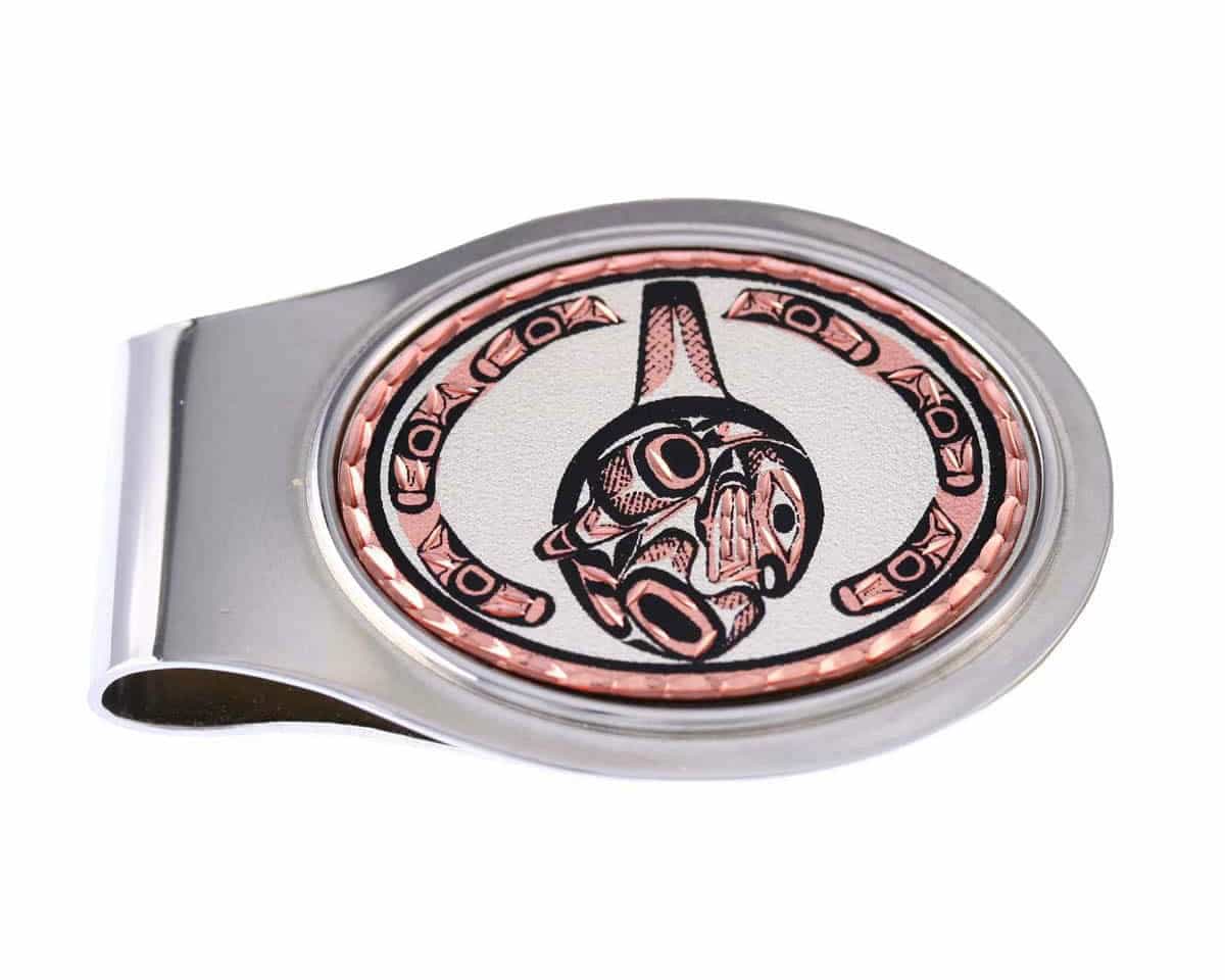 These silver color oval money clips with silver plated and diamond cut copper artwork in Native American West Coast killer whale design will make a great addition for Native trading posts and gift shops in Canada and the United States. The Killer whale or Orca is one of the most prominent subjects for Pacific Northwest coast artists. The killer whale is regarded as the guardian as well as the ruler of the sea because of its sheer size and power. The killer whale is also seen as the best hunter of the sea.