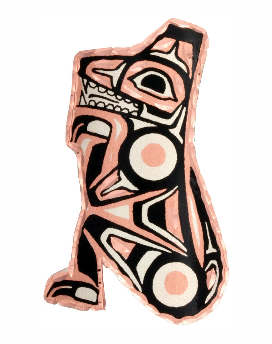 These remarkable unique brooches are silver plated and diamond cut by skilled artisans in this Northwest Native bear totem. The Bear symbolizes strength, family, vitality, courage and health. He is a thoughtful creature and of great support and comfort to those who crave human company. He makes lonely periods of life far easier.