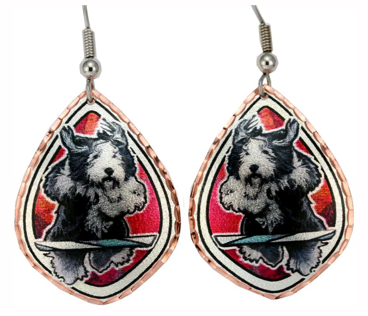 Old English sheepdog earrings are made from copper in colorful dog artwork designed by Lynn Bean. Shop lovely and fun-to-wear sheepdog earrings. These wonderful diamond shape earrings are 25 mm x 32.8 mm ( about 0.98 x 1.3 inches ) in size. Looking at our prices you might be surprised to learn that we use only high-quality components such as pure copper and the best quality surgical steel hypoallergenic ear wires.