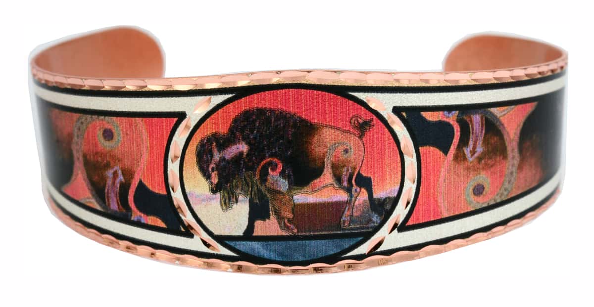 These unique handmade bracelets are silver plated and diamond cut on copper in this inspired Prairie Prince buffalo artwork by Bob Coonts. The buffalo was a sacred animal for Native American tribes, as it fulfilled their basic needs of milk, meat, clothing and shelter. The buffalo symbolizes wisdom, generosity, gratitude and personal power.