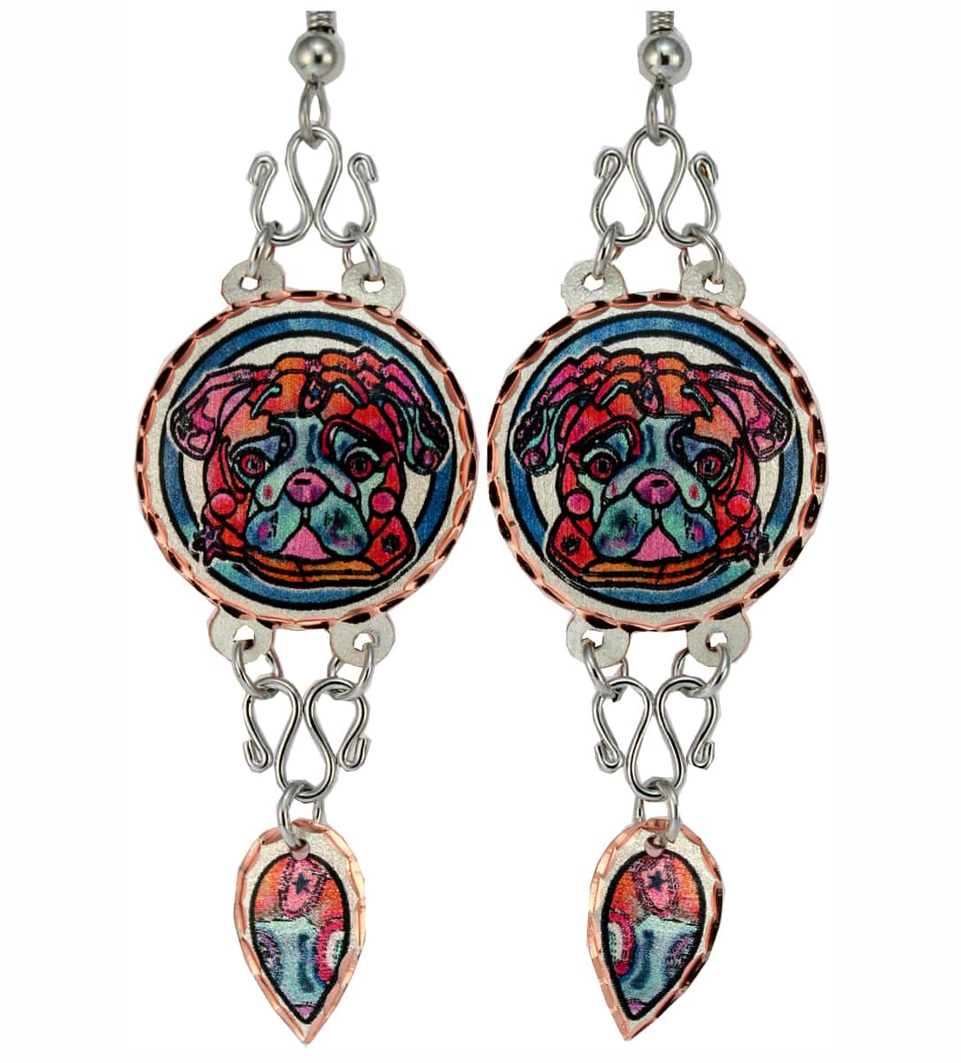 Pug dog earrings with wire dangles offered in colorful whimsical artwork.